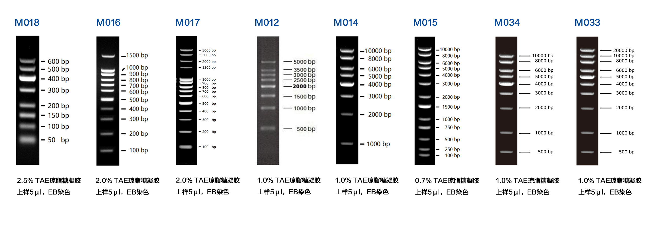 本產(chǎn)品為預混有 1x 上樣緩沖液的即用型 DNA 分子量標準,由 8 條線狀雙鏈 DNA 條帶組成,適用于對 1000-10000 bp 的雙鏈 DNA 分子大小的估算和粗略定量。本產(chǎn)品的 8 條帶分別為 1000、2000、3000、4000、5000、6000、8000 和 10000 bp。其中 4000 bp 條帶濃度最大,為 20 ng/µl,其余條帶濃度約為 10 ng/µl。