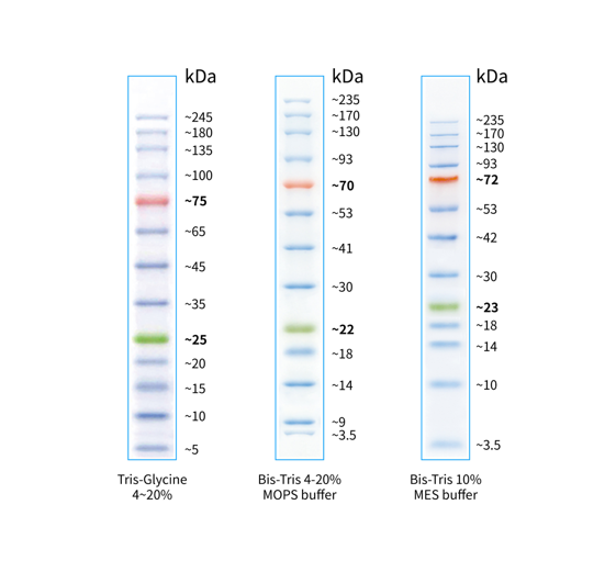 本產(chǎn)品由跨度從 5-245 kDa 的 13 種高度純化預(yù)染的重組蛋白質(zhì)組成,各條帶濃度約為 0.1-0.4 mg/ml。其中 25 kDa 條帶為綠色預(yù)染條帶,75 kDa 條帶為紅色預(yù)染條帶,方便判斷各個(gè)條帶的準(zhǔn)確位置。本產(chǎn)品適合作為 SDS-PAGE 電泳時(shí),變性蛋白樣品的分子量參照,并可實(shí)時(shí)觀察蛋白樣品的電泳分離狀況,也可用于檢測(cè) Western blot 的轉(zhuǎn)膜效率。由于共價(jià)結(jié)合的染料會(huì)影響蛋白質(zhì)分子的電泳遷移率,本產(chǎn)品僅適于粗略地估計(jì)目的蛋白樣品的分子量。