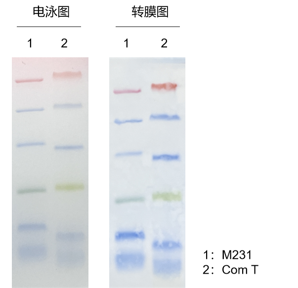 分別使用GenStar #M230 和 Com T進(jìn)行電泳,Tricine 膠濃度18%,上樣量5 μl、電壓150 V,電泳100 min,電泳結(jié)束后進(jìn)行轉(zhuǎn)膜實驗,轉(zhuǎn)膜電壓200 V、時間60 min。結(jié)果顯示,M230電泳和轉(zhuǎn)膜條帶均清晰可見,小條帶效果優(yōu)于Com T。