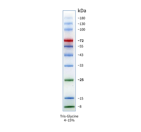 本產(chǎn)品包含了 8-180 kDa 的 10 種高度純化預(yù)染的重組蛋白質(zhì)。10 種條帶分別為:8、15、25、33、43、55、72、100、130、180 kDa。其 8 kDa 和 25 kDa 條帶為綠色預(yù)染條帶,72 kDa 條帶為橙紅色預(yù)染條帶,方便判斷各個條帶準(zhǔn)確位置。 本產(chǎn)品包裝便利,為即用型產(chǎn)品,請勿加熱、稀釋或添加還原劑。使用本產(chǎn)品可動態(tài)觀察蛋白電泳狀態(tài)和轉(zhuǎn)膜效果。經(jīng) SDS-PAGE 電泳后轉(zhuǎn)移到 PVDF 膜、NC 膜上可見清晰的彩色條帶。預(yù)染蛋白與染料結(jié)合后,在不同緩沖體系中,位置會有遷移,本產(chǎn)品在用于判斷目的蛋白分子量大小時僅供參考。