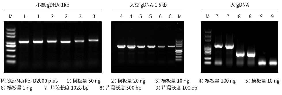 以小鼠 gDNA(50 ng、20 ng、10 ng)大豆 gDNA(100 ng、10 ng、1 ng)和人 gDNA(50 ng)為模板,使用 A008 擴(kuò)增進(jìn)行擴(kuò)增。結(jié)果顯示,A008 對動(dòng)物、植物等不同來源模板擴(kuò)增性能表現(xiàn)優(yōu)異