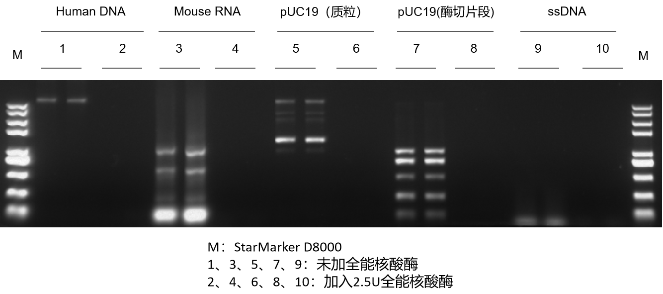 在 20 μl 體系中,使用 2.5 U GenStar #A511對(duì) 1 μg不同類型的 DNA 和 RNA 37℃ 孵育 40 min。結(jié)果顯示,A511 可高效降解不同類型 DNA 和 RNA。