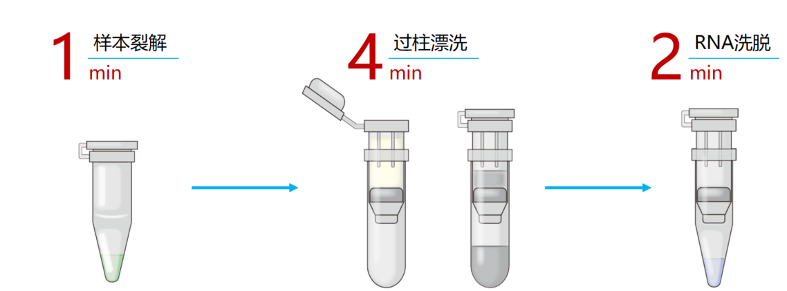 操作步驟簡(jiǎn)單快速,可在 7 min 內(nèi)完成單個(gè)樣品 RNA 的提取,無需使用苯酚和氯仿等有機(jī)溶液,操作安全性更高。