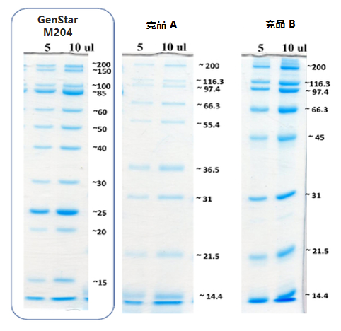 本產(chǎn)品包含了 12 種未染色重組蛋白的混合物,預(yù)先用上樣緩沖液稀釋,用于 SDS-PAGE 電泳。通過(guò) SDS-PAGE 電泳并經(jīng)考馬斯亮藍(lán)染色后,在 10-200 kDa 范圍內(nèi)會(huì)形成 12 條明亮清晰的條帶。12 種條帶分別為:10、15、20、25、30、40、50、60、85、100、150、200 kDa,其中增強(qiáng)的蛋白條帶為 25 kDa 和 85 kDa。本產(chǎn)品為非預(yù)染型蛋白分子量標(biāo)準(zhǔn),可準(zhǔn)確的反映目的蛋白樣品的分子量。