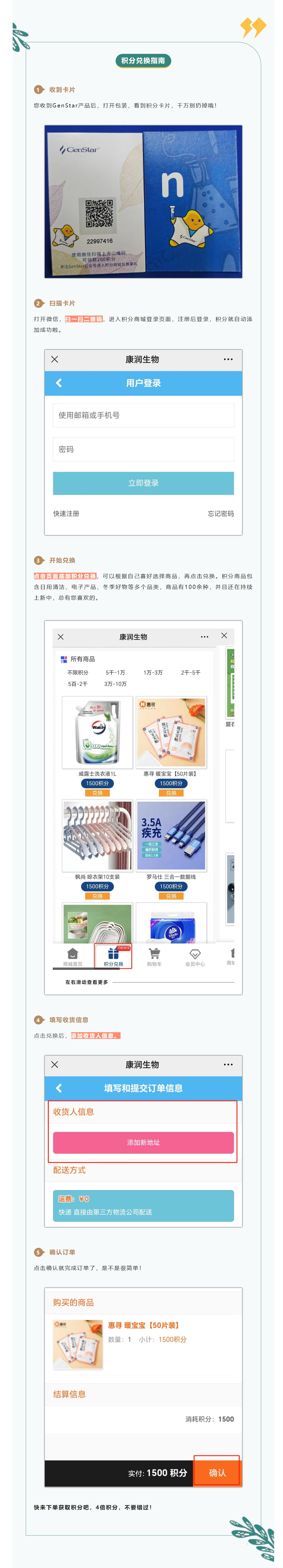 作為GenStar產(chǎn)品忠實(shí)用戶,不會(huì)用積分,那豈不是錯(cuò)過(guò)了一個(gè)億?積分可用于GenStar積分商城(點(diǎn)擊進(jìn)入)兌換禮品,積分越多,禮品越優(yōu)厚。不知道怎么操作?別擔(dān)心,來(lái)看看下方的兌換指南!