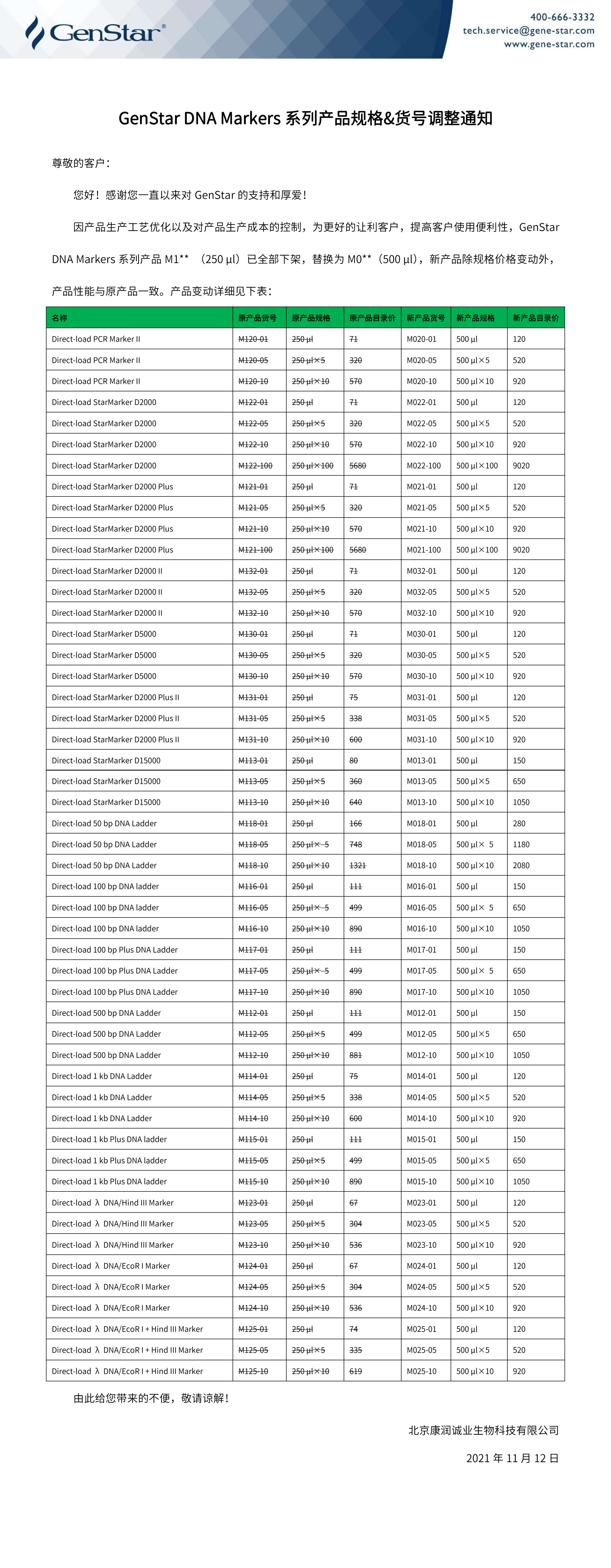 GenStar DNA Markers 系列產(chǎn)品規(guī)格&貨號調(diào)整通知