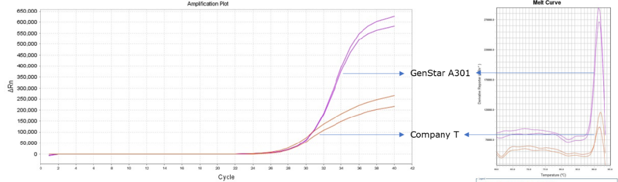 以 Hela 細(xì)胞 cDNA 為模板,按10倍濃度梯度稀釋,根據(jù) Ct 值構(gòu)建標(biāo)準(zhǔn)曲線。結(jié)果顯示,GenStar #A301 擴(kuò)增效率高、標(biāo)準(zhǔn)曲線線性范圍寬、重復(fù)性好。