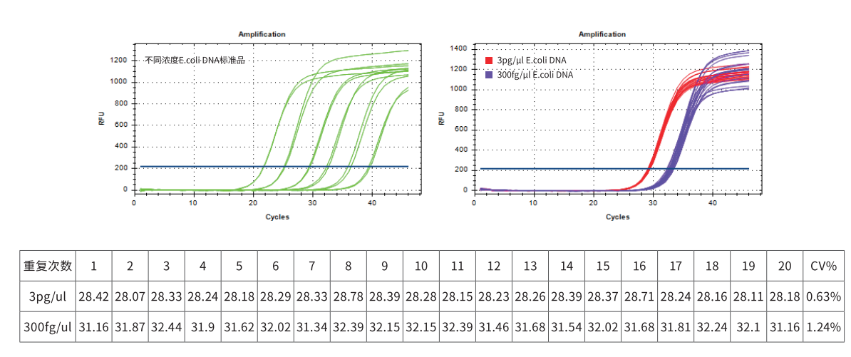 重復(fù) 20 次檢測 3 pg/μl 和 300 fg/μl 的 E.coli DNA,CT 值 CV<5%,結(jié)果顯示 GenStar #A801 重復(fù)性好。