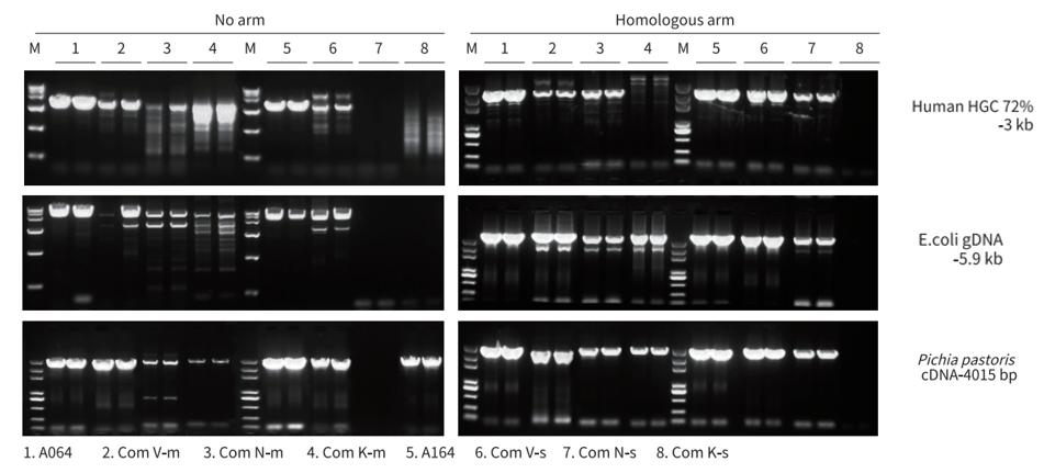 設(shè)計常規(guī) PCR 引物與增加了同源臂的 PCR 引物,使用 A064/A164、Com V、Com N、Com K 進(jìn)行擴增。結(jié)果顯示,A064/A164 對含同源臂片段擴增效果良好