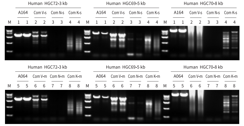 以 Human gDNA 為模板,分別使用 A064/A164、Com V、Com N、Com K 擴增不同 GC 含量的目的片段。結(jié)果顯示,SuperNova 對高 GC 模板擴增能力強,且優(yōu)于 Com V、Com N、Com K