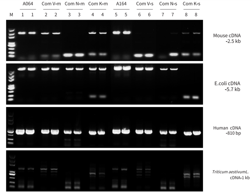 分別以人、小鼠、E.coli cDNA 為模板,使用 A064/A164、Com V、Com N、Com K 進(jìn)行不同長度片段擴增。結(jié)果顯示,A064/A164 對不同種屬來源不同長度的 cDNA 片段兼容性強,均能良好擴增