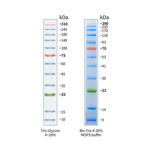 本產品由跨度從 10-310 kDa 的 12 種高度純化預染的重組蛋白質組成,各條帶濃度約為 0.1-0.4 mg/ml。其中 25 kDa 條帶為綠色預染條帶、75 kDa 和 310 kDa 條帶為紅色預染條帶,方便判斷各個條帶的準確位置。本產品適合作為 SDS-PAGE 電泳時,變性蛋白樣品的分子量參照,并可實時觀察蛋白樣品的電泳分離狀況,也可用于檢測 Western blot 的轉膜效率。由于共價結合的染料會影響蛋白質分子的電泳遷移率,本產品僅適于粗略地估計目的蛋白樣品的分子量。