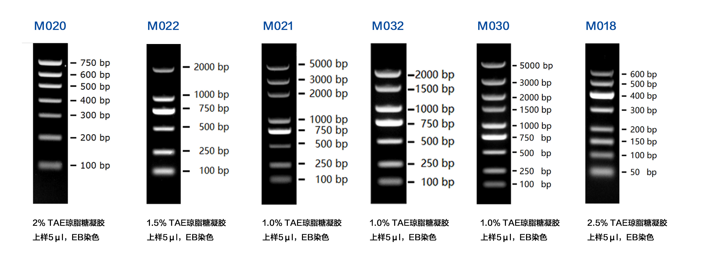 本產品為預混有 1x 上樣緩沖液的即用型 DNA 分子量標準,由 7 條線狀雙鏈 DNA 條帶組成,適用于對 100-750 bp的雙鏈 DNA 分子大小的估算和粗略定量。本產品的 7 條帶和濃度分別為 750 bp(15 ng/ul)、600 bp(12 ng/ul)、500 bp(10 ng/ul)、400 bp(8 ng/ul)、300 bp(6 ng/ul)、200 bp(8 ng/ul)、100 bp(10 ng/ul)。