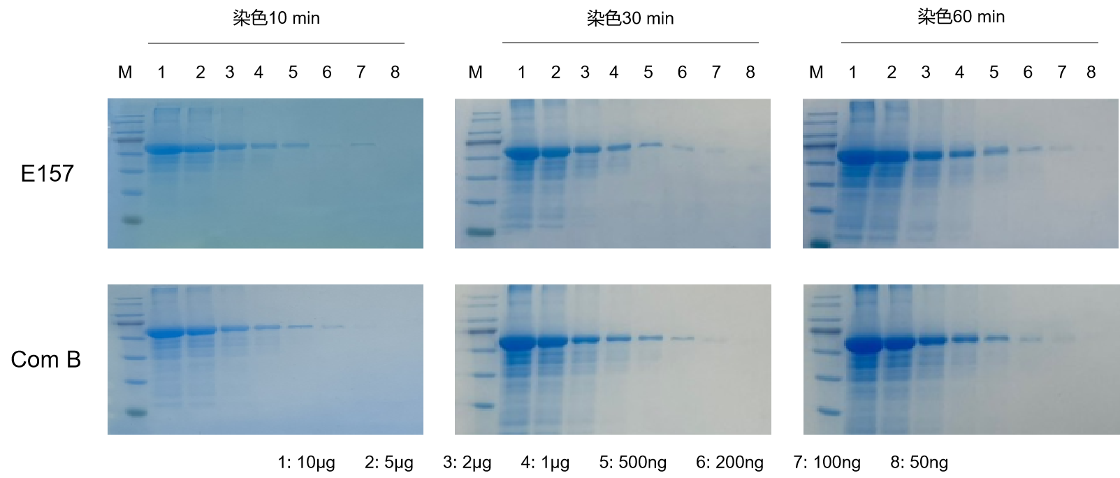 不同蛋白上樣量,經(jīng)不同時(shí)間染色及脫色后,可看到清晰的目標(biāo)蛋白條帶。結(jié)果顯示,E157 在 10 min 時(shí)可見(jiàn) 200 ng 條帶,30 min可見(jiàn) 100 ng 條帶,60 min 可見(jiàn)低至50 ng條帶,因此,E157染色速度快、靈敏度高。