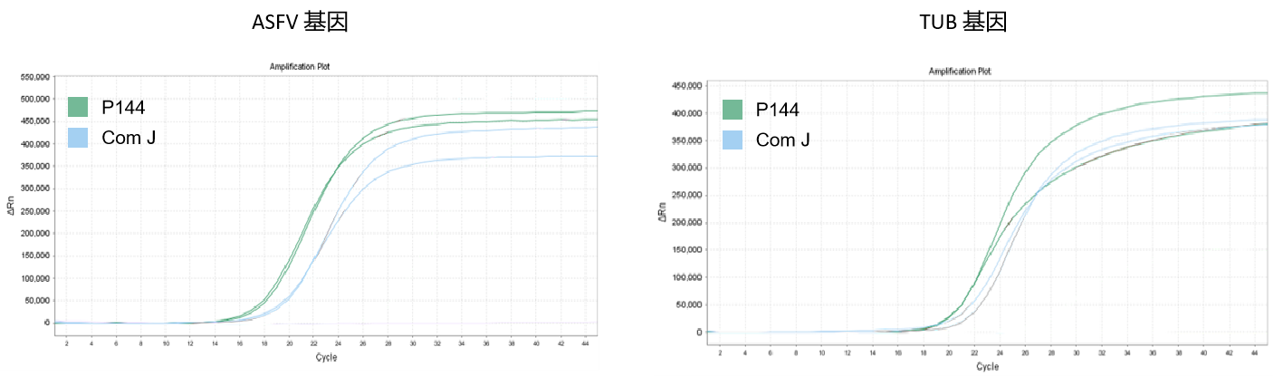以 50 mg 含有非瘟病毒(ASFV)的豬肉組織為樣品,使用 GenStar #P144 和 Com J,室溫孵育 5 min 后進(jìn)行核酸提取,提取后進(jìn)行 qPCR 檢測(cè)。結(jié)果顯示,P144 提取效率高,且優(yōu)于 Com J。
