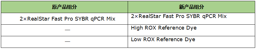 自 2024.08 起,該產(chǎn)品進(jìn)行了組分優(yōu)化。優(yōu)化后的產(chǎn)品提供兩種濃度 ROX 參比染料即 High ROX Reference Dye 和 Low ROX Reference Dye,增加了產(chǎn)品適用性。