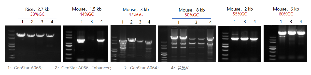 以 Mouse、Rice gDNA 為模板,使用 GenStar A066 和 GenStar A064、競品 V 分別擴增不同 GC 含量的目標(biāo)片段。