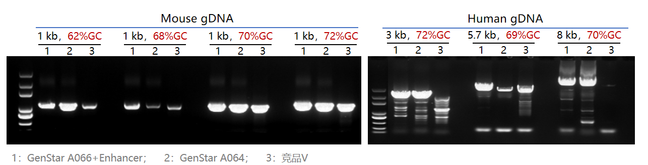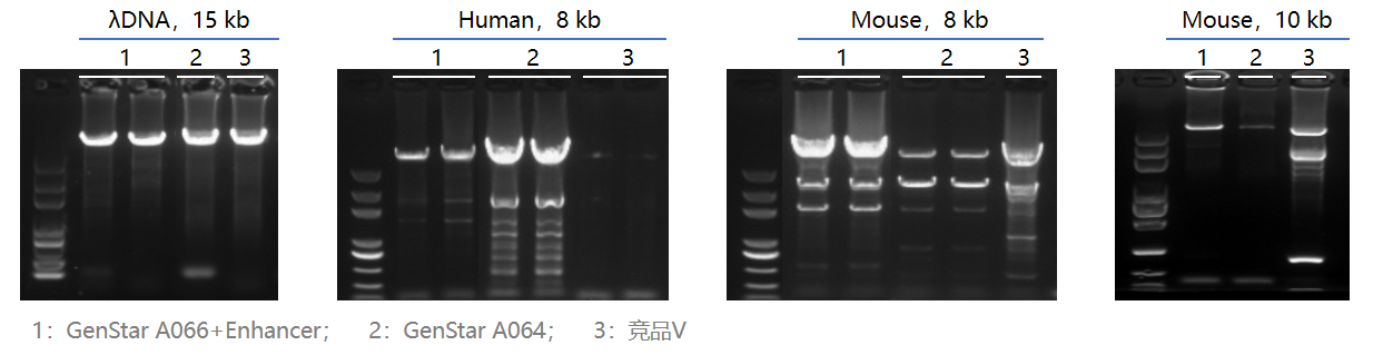 以 λDNA、Human gDNA、Mouse gDNA 為模板,使用 GenStar A066、A064 和競品 V 三種高保真 DNA 聚合酶分別擴增 15kb、8kb、10kb 的片段。
