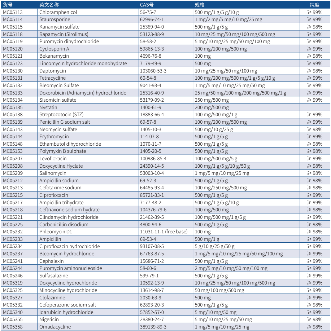 抗生素,主要是由細(xì)菌、霉菌或其他微生物產(chǎn)生的次級代謝產(chǎn)物或人工合成的類似物。通??梢岳斫鉃槟軌驓⑺兰?xì)菌或抑制其生長的試劑,主要用于治療各種細(xì)菌感染或致病微生物感染類疾病,一般情況下對其宿主不會(huì)產(chǎn)生嚴(yán)重的副作用。GenStar 目前可提供多種抗生素用于科學(xué)研究,充分滿足您的實(shí)驗(yàn)需求,為您的實(shí)驗(yàn)保駕護(hù)航。