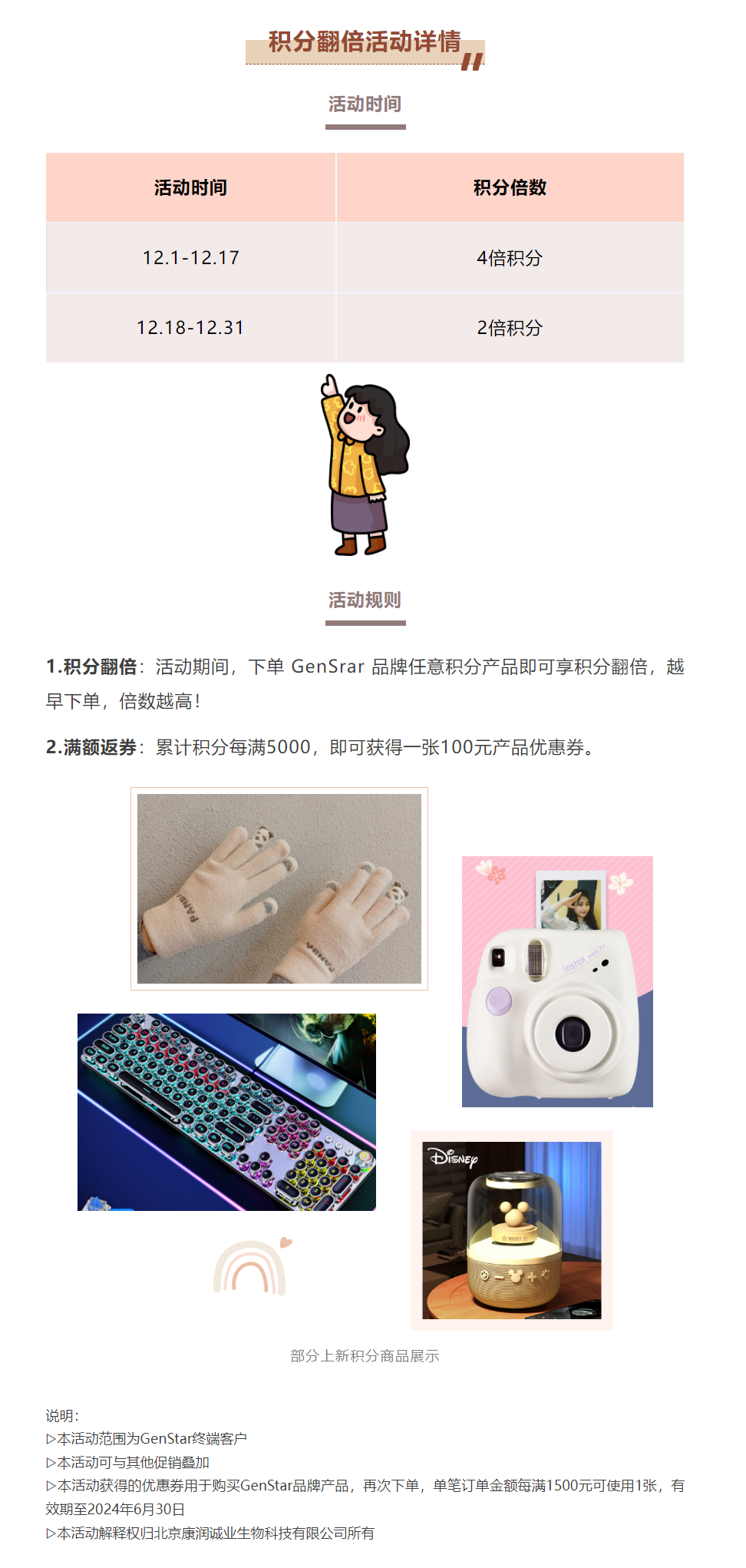 同時,12.1-12.31 下單 GenStar 品牌產(chǎn)品,還有積分翻倍加持,越早下單,翻倍越高,最高可獲得 4 倍積分哦。積分商城商品持續(xù)上新中......快來下單領(lǐng)取積分,兌換您的心水好物吧~